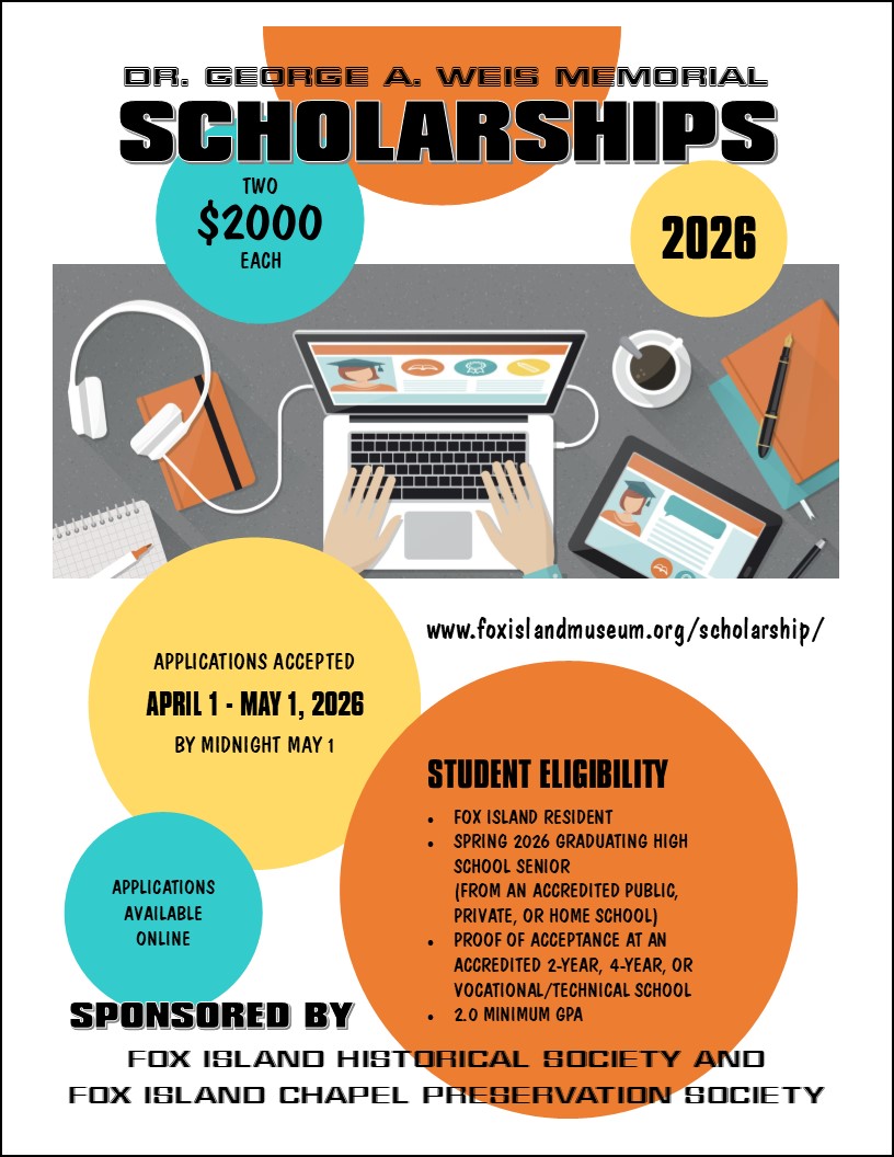 The Fox Island Historical Society (FIHS) Board of Directors is giving a $2,000 scholarship in 2026 in memory of Dr. George A Weis. In addition, the Fox Island Chapel Preservation Society (FICPS) will award a $2,000 scholarship. The scholarships will recognize well-qualified high school seniors graduating in the spring of 2026 to help finance a post-high school education beginning in the fall of 2026. The applicants must be residents of Fox Island at the time of high school graduation.